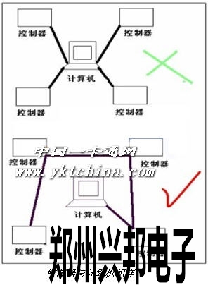 控制器通訊線(包括485/422、232和韋根等通訊線)必須采用國際通用的8芯屏蔽雙絞線,這樣可有效防止和屏蔽干擾。線徑大于0.3mm總線長度不超過1200建議在1000米以內(nèi),如果更長請(qǐng)選用其它專用485/232轉(zhuǎn)換器或者加中繼器,并選用更粗的通訊電纜??刂破鱃ND 485- 485+分別對(duì)應(yīng)連接485轉(zhuǎn)換器GND TD(A) TD(B),通訊線路采用串聯(lián)掛接式連接,請(qǐng)勿采用星型連接或者局部星型連接(如圖)。