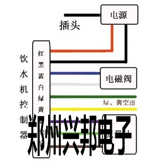 紅線(xiàn)----->12V電源正極,黑線(xiàn)----->12V電源負(fù)極,藍(lán)線(xiàn)----->電磁閥一端,白線(xiàn)----->電磁閥另一端,綠線(xiàn)、黃線(xiàn)空出,紫線(xiàn)----->流量計(jì)負(fù)極,淺綠線(xiàn)----->流量計(jì)信號(hào)線(xiàn),棕線(xiàn)----->流量計(jì)正極。