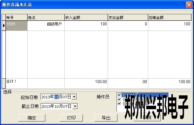 4.查詢操作員賬戶匯總是在操作員流水匯總表中,可根據(jù)日期查詢到收入、支出及應繳的金額。