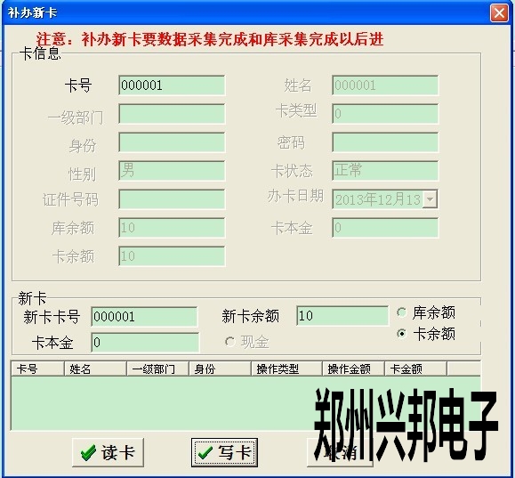 2. 此卡掛失后,然后點卡管理--補辦新卡,打開此對話框后輸入卡號后按回車鍵,當(dāng)出現(xiàn)卡信息時,把新卡放到讀卡器上點讀卡,然后點寫卡即可,如下圖所示