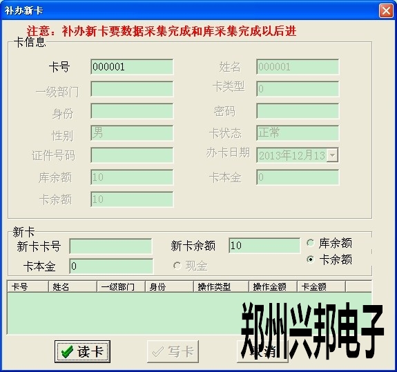 3. 此時(shí)先在軟件中把000001這張卡掛失了,然后點(diǎn)卡管理--補(bǔ)辦新卡(確保數(shù)據(jù)全部采集完),打開(kāi)對(duì)話框后輸入卡號(hào)按回車(chē)鍵,當(dāng)出現(xiàn)卡信息后,把編號(hào)為000001的這張卡放到讀卡器上點(diǎn)讀卡,然后點(diǎn)確定即可。