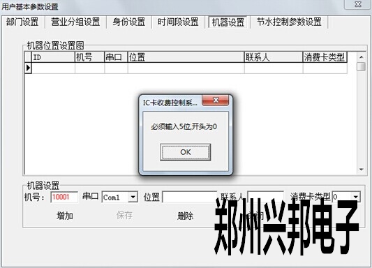在軟件上添加水控機(jī),售飯機(jī)相應(yīng)的機(jī)器號(hào):打開軟件,系統(tǒng)管理---用戶參數(shù)設(shè)置---用戶基本參數(shù)設(shè)置---機(jī)器設(shè)置,在機(jī)號(hào)那添加相應(yīng)的機(jī)器號(hào),例如10001就是1號(hào)機(jī),串口選擇電腦所用的通訊串口。如下圖所示,圖中所用的通訊串口為COM1。但在極其特殊的情況下,會(huì)出現(xiàn)錯(cuò)誤提示,機(jī)器號(hào)開頭為0。如圖所示。