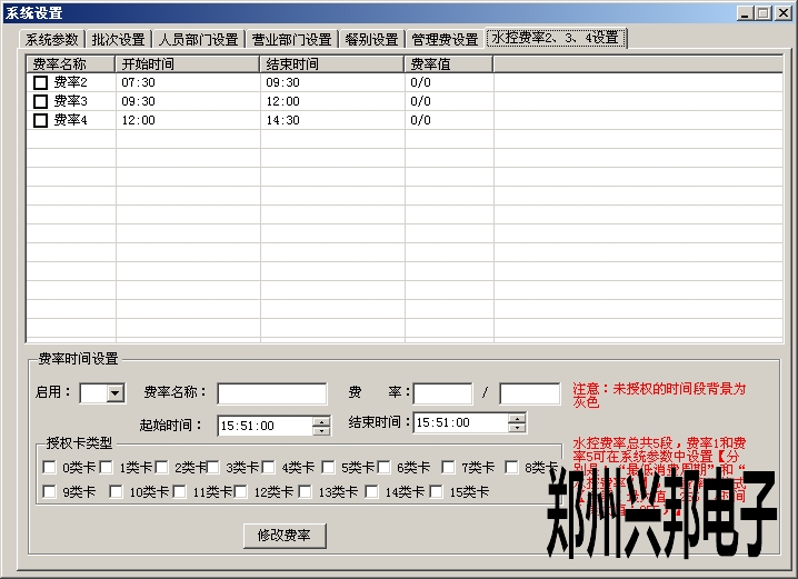2、設(shè)置幾點(diǎn)到幾點(diǎn)之音流多長(zhǎng)時(shí)間扣多少錢(qián),在管理中心-系統(tǒng)設(shè)置-水控費(fèi)率2、3、4設(shè)置里面設(shè)置時(shí)間,費(fèi)率。