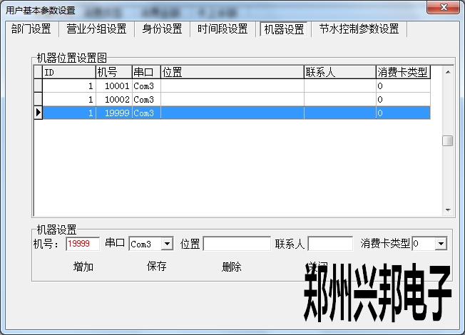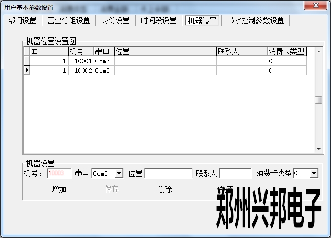 在機(jī)器設(shè)置中可以添加機(jī)器,設(shè)置機(jī)器號(hào)、串口以及消費(fèi)卡類型,位置、聯(lián)系人可以選填。其中設(shè)置機(jī)器號(hào)必須輸入5位,開頭為1,最大可設(shè)置為19999.串口是指通訊器連接電腦的端口號(hào),此處的串口號(hào)選擇不正確的話會(huì)導(dǎo)致機(jī)器不通訊。