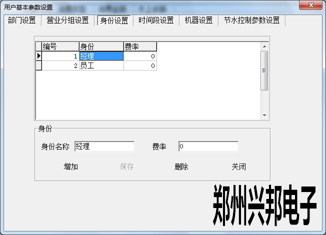 身份設(shè)置是對(duì)持卡人身份的說(shuō)明,通過讀卡可以看到此人的身份。直接輸入身份名稱,費(fèi)率填寫0,暫不起作用,點(diǎn)擊增加,增加成功后,選中信息進(jìn)行雙擊可以對(duì)身份名稱進(jìn)行修改,也可以刪除。