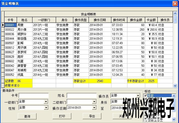 2、要是想要知道操作員收入和支出的名細,就要在資金明細表里查看的。數(shù)據(jù)管理--資金明細表。這里可以選擇存款,取款,開戶,退款都可以查到。