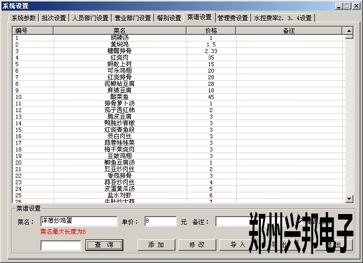 添加菜單時(shí),輸入菜名、單價(jià)、備注(可填可不填)、選擇是否啟用,然后點(diǎn)擊添加即可。添加后可修改、導(dǎo)入、導(dǎo)出菜名、單價(jià)等信息,最多可添加2000個(gè)菜單,菜單添加后不能刪除,可以選擇是否啟用。菜名最大為8個(gè)漢字,可以為漢字、數(shù)字、字母或者特殊字符。