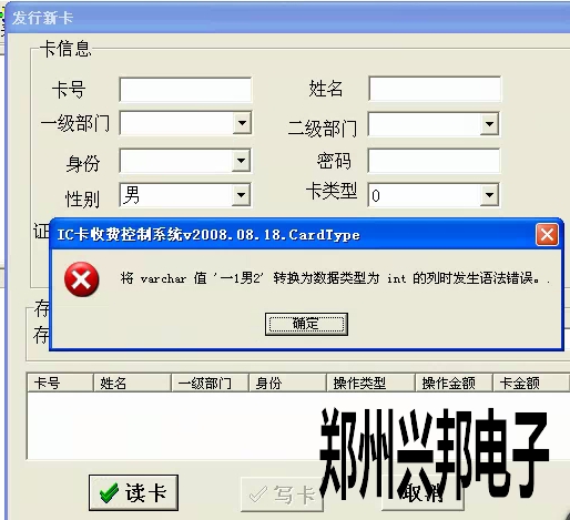 客戶使用的是我們的局域網(wǎng)一卡通食堂售飯機,在使用我們軟件時,新卡無法發(fā)行,在發(fā)行新卡的時候出現(xiàn)了將varchar值‘一1男2’轉(zhuǎn)換為數(shù)據(jù)類型為int的列時發(fā)生語法錯誤。