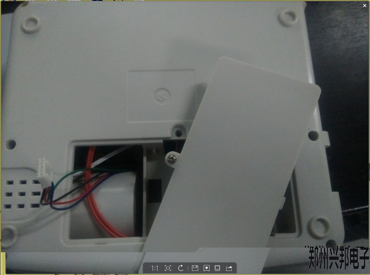 如圖1-1所示,打開機(jī)器背部電池蓋,小心去除小票打印機(jī)上邊插著的5p線。把線插到做好的升級(jí)工具線的5p插座上即可。