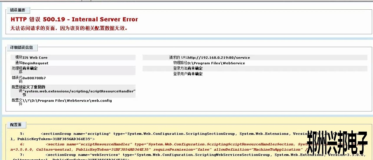 [文章內(nèi)容簡介]:客戶使用的互聯(lián)網(wǎng)一卡通食堂售飯機(jī),在裝好軟件后配置有誤,瀏覽service時(shí)提示應(yīng)用程序中的服務(wù)器錯(cuò)誤.