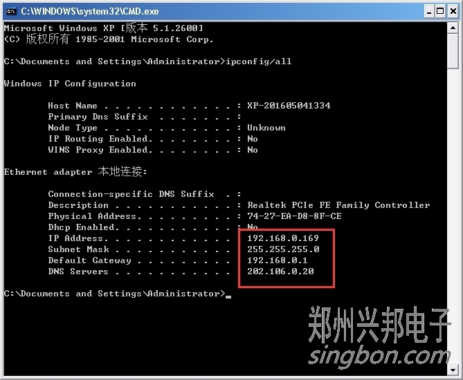 4.我們可以看到紅色方框內(nèi)就是我們所要查看的IP地址、網(wǎng)關(guān)、和dns了。