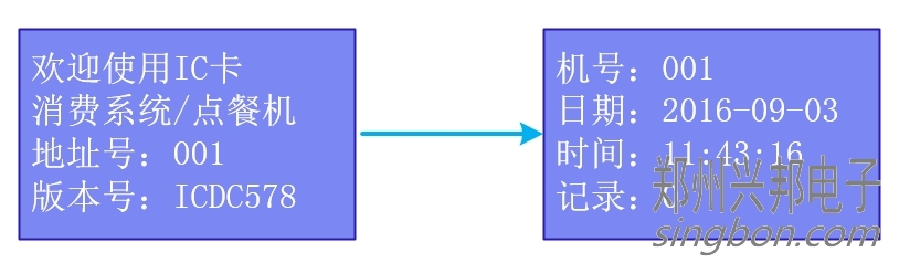 將消費機插上12V電源,開機時顯示版本號和機器號,最后轉入待機界面,顯示機器號、日期、時間界面。