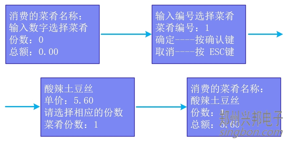 ① 自動模式:輸入菜肴編號,點擊確認后選擇份數(shù),點擊確任后出現(xiàn)消費的菜肴名稱、份數(shù)、總額,將卡片放于刷卡區(qū),即可進行扣費,扣費后顯示扣費金額、手續(xù)費用、卡上余額、卡號,操作流程如下圖所示: