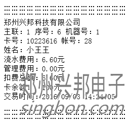 ② 計算模式:輸入扣費金額,按[確認]鍵后,將卡片放于刷卡區(qū),即可進行扣費,若連接的有打印機,可直接打印消費明細,打印出的信息如下圖所示:
