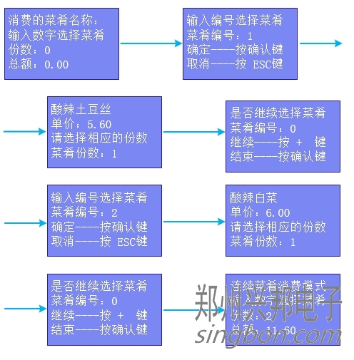 ③ 連續(xù)菜肴消費模式:輸入菜肴編號,點擊確認后選擇份數(shù),點擊確認后出現(xiàn)“是否繼續(xù)選擇菜肴,菜肴編號:0,繼續(xù)----按 + 鍵,結束----按確認鍵”,點擊“+”號,輸入下一份菜肴編號,點擊確認后選擇份數(shù),點擊確認后出現(xiàn)是“是否繼續(xù)選擇菜肴,菜肴編號:0,繼續(xù)----按 + 鍵,結束----按確認鍵”,點擊確認,出現(xiàn)消費的份數(shù)、總額,將卡片放于刷卡區(qū),即可進行扣費,扣費后顯示扣費金額、手續(xù)費用、卡上余額、卡號,操作流程如下圖所示:
