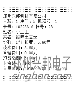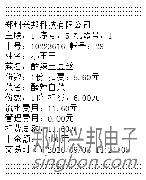 3) 自動消費模式:最多可設置8個費率,每個費率可設置對應的菜肴、份數(shù),將費率設置好之后在自動模式下輸入相應的費率編號放卡即可自動扣除相應費用。只有計算和自動模式可以用,計算模式只作為查看使用,不能扣費。若連接的有打印機,可打印消費明細,打印出來的消費明細格式如下圖所示: